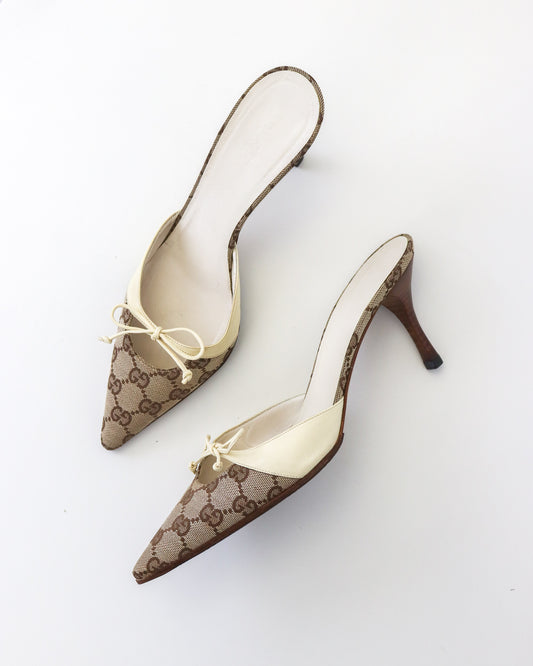 Vintage 2000s Gucci Monogram Canvas Bamboo Horsebit Detail Kitten Heel Mules / 37.5 (US 7.5)