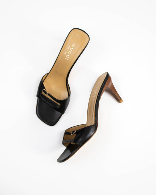 Vintage 1990s Gucci by Tom Ford Black Double Strap Cut-out Detail Mule Heels / 37.5 (US 7.5)