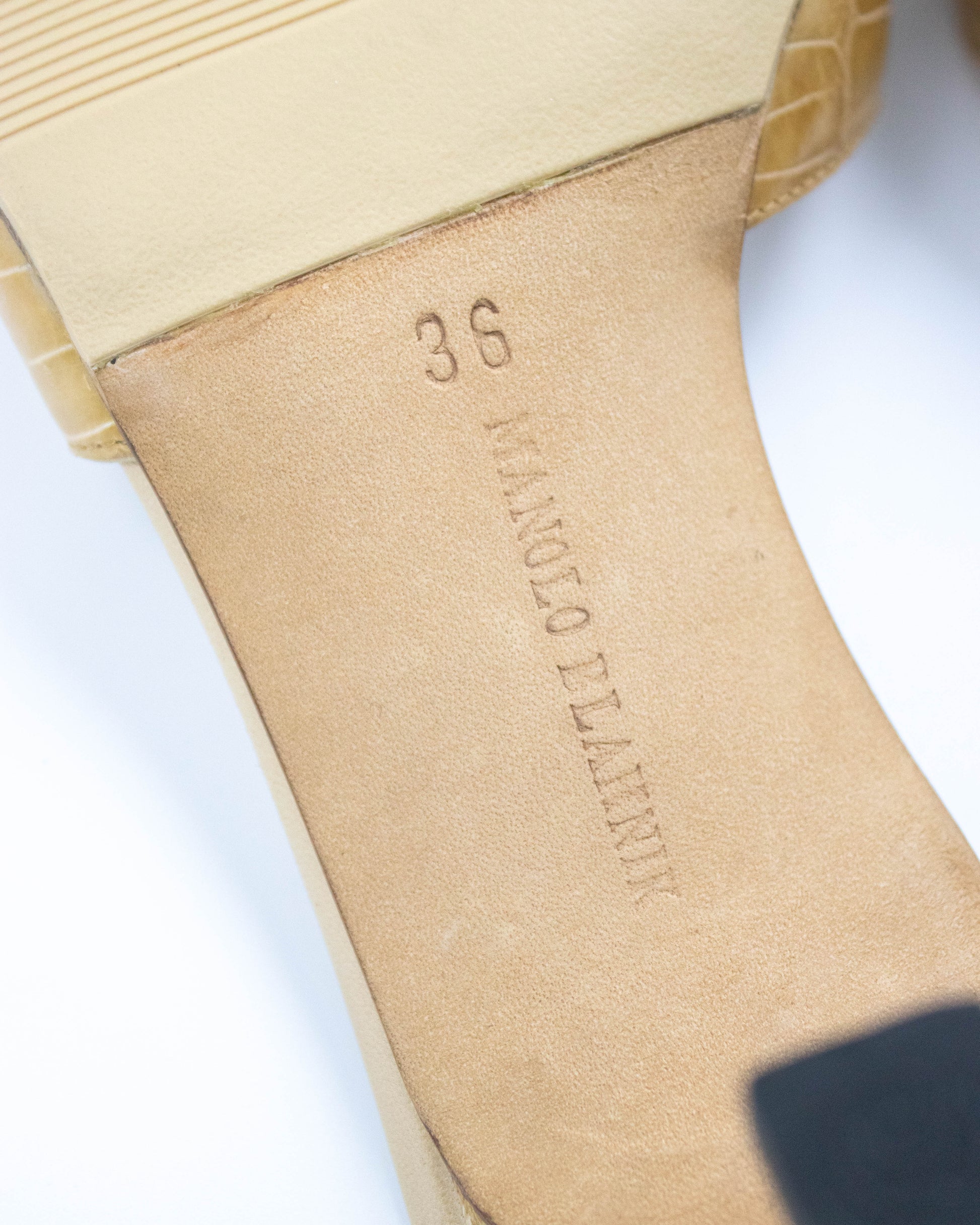 Vintage Manolo Blahnik Callamu Beige Croc Leather Kitten Heel Mules / 36 (US 6)