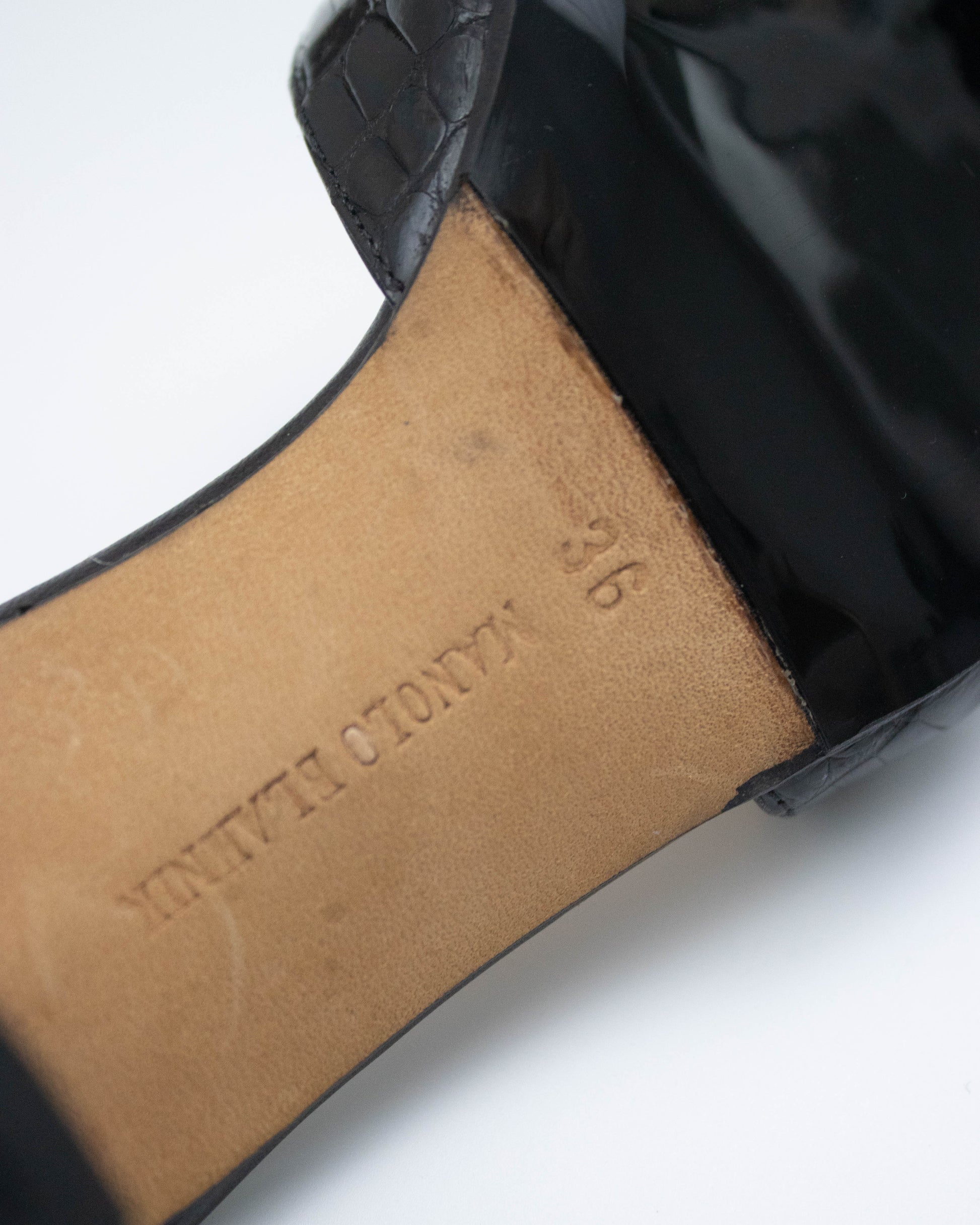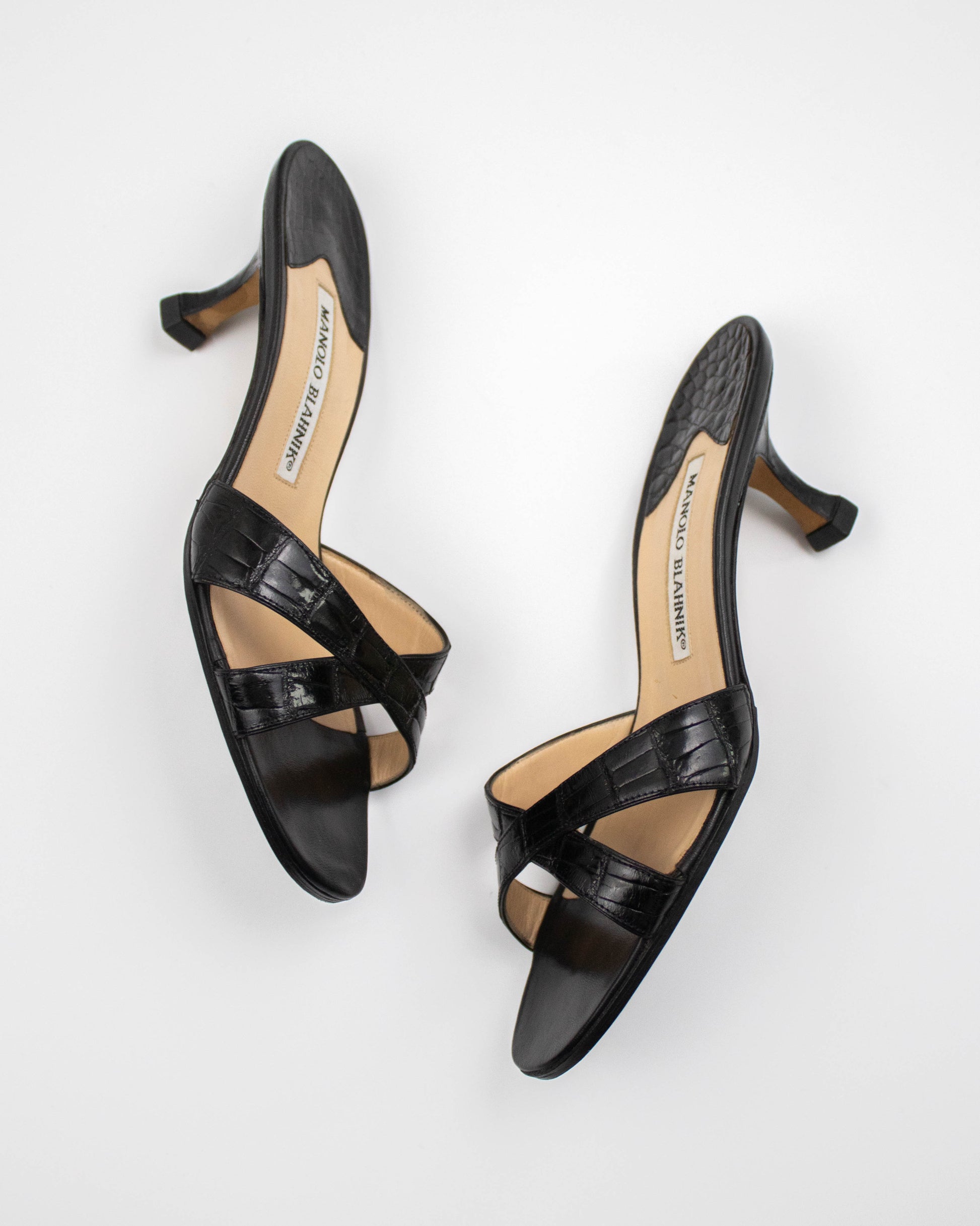 Vintage Manolo Blahnik Callamu Black Croc Leather Kitten Heel Mules / 36 (US 6)