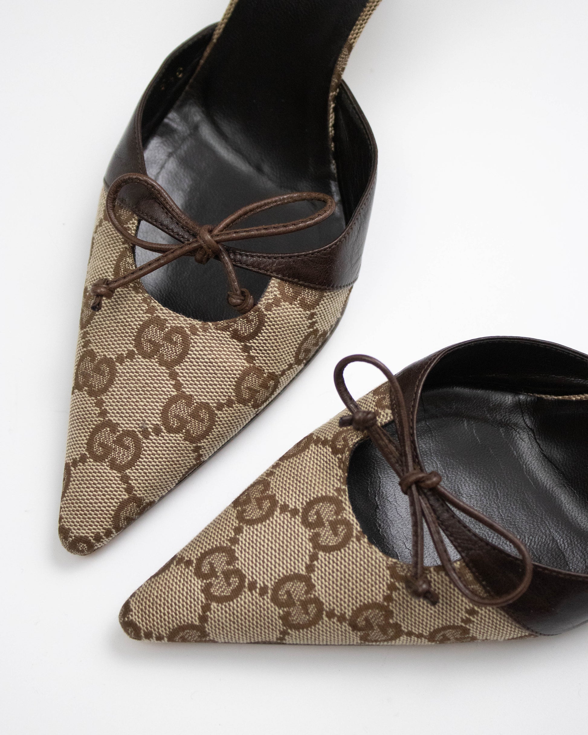 Vintage 2000s Gucci pointed toe monogram canvas mules with bow detail